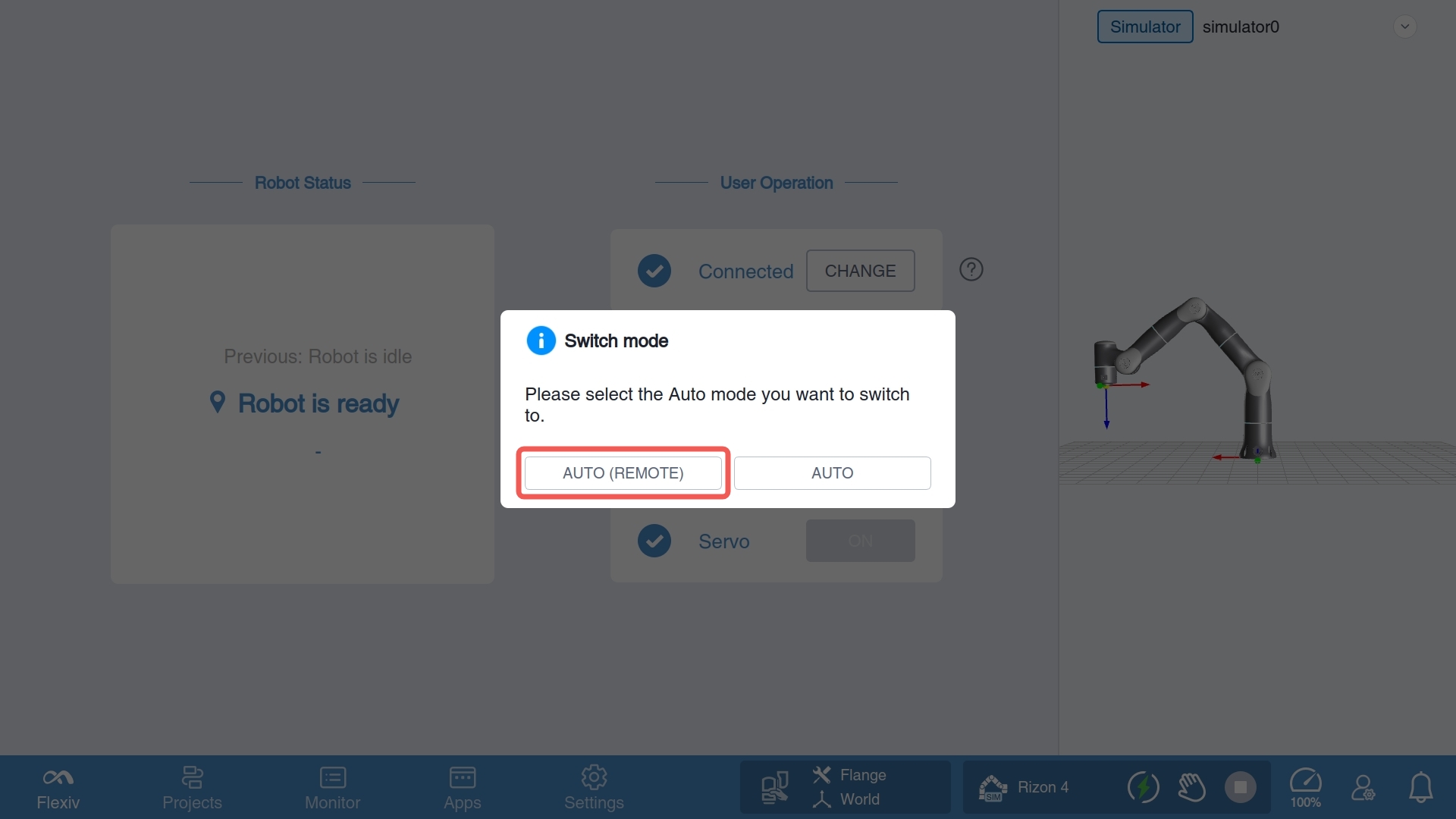 With the Remote mode for RDK enabled in settings, if the robot has booted into Manual mode instead of Auto mode, it can still enter Remote mode with the help of Flexiv Elements: